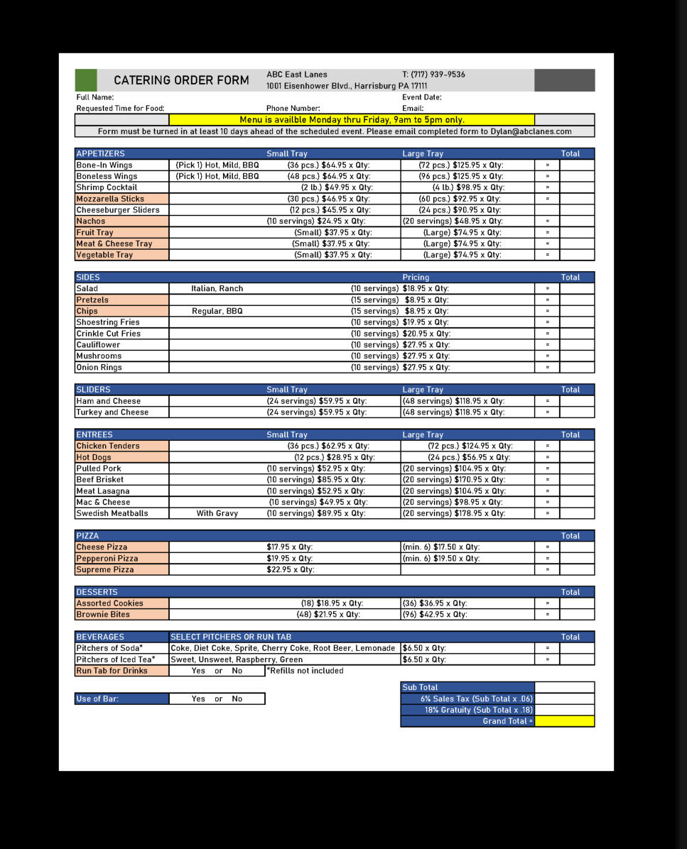 Catering order forms must be returned 10 days prior to your scheduled event.