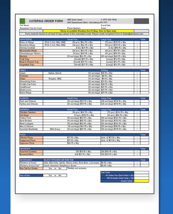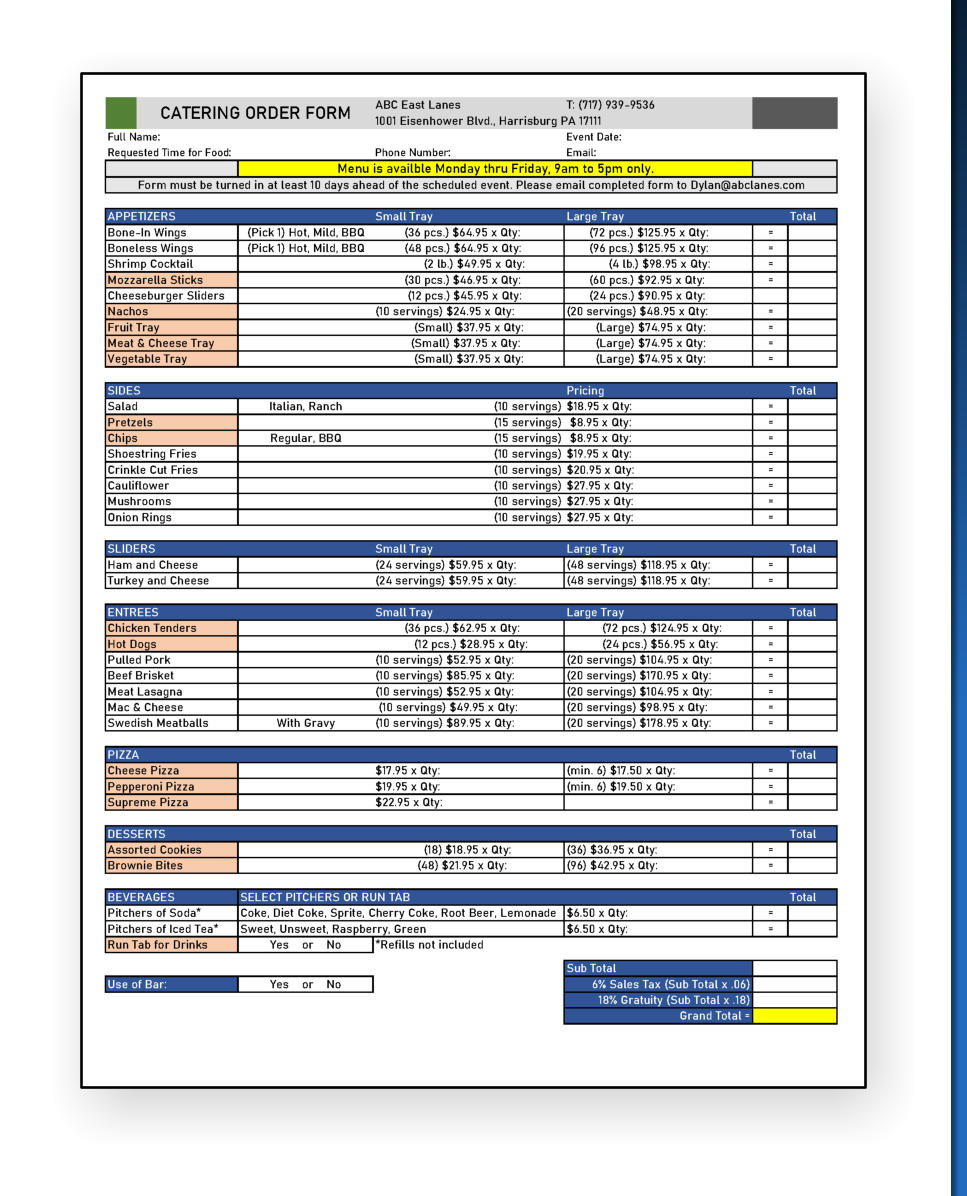 Catering order forms must be returned 10 days prior to your scheduled event.